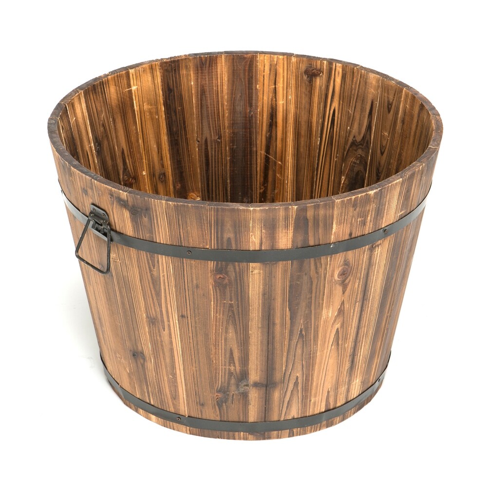 Create a beautiful garden space with our Large Round Planter, crafted from authentic wood with a weather-resistant brown finish. This planter is built to last, thanks to its durable steel support bands, and features a built-in drain hole to help your plants thrive.