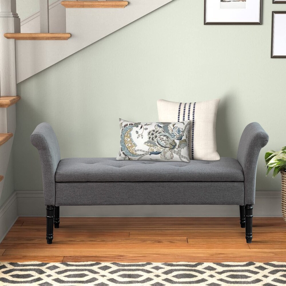 Upgrade the look and functionality of your bedroom with our Storage Ottoman Bench with Arms. Upholstered in black faux leather with tufted details, this bench features a fireproof sponge for added safety and easy cleaning. The hidden storage compartment allows you to keep your space organized and clutter-free, while the cushioned padded seat provides comfort for long periods of sitting. With high quality wooden legs and rubber feet protectors, this bench is durable enough to seat 2-3 people. Assembly is a breeze with all tools provided in the package.