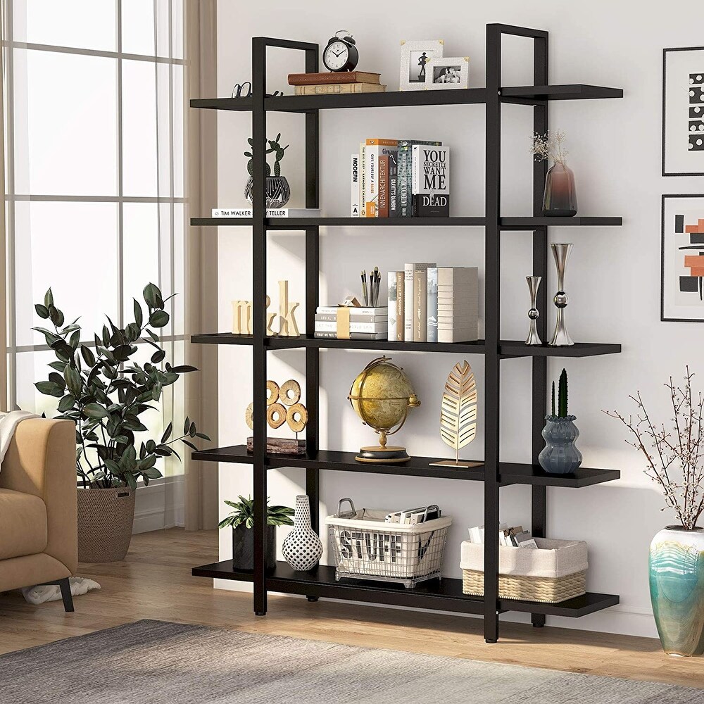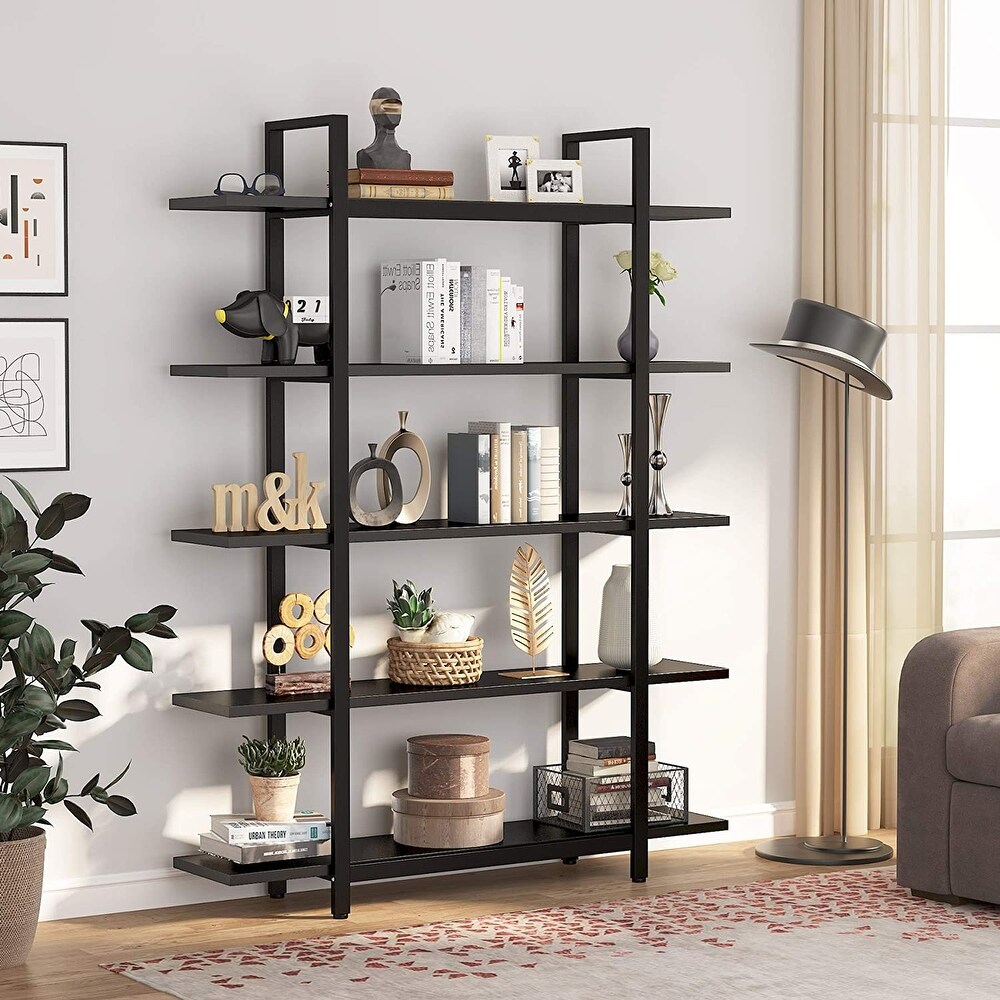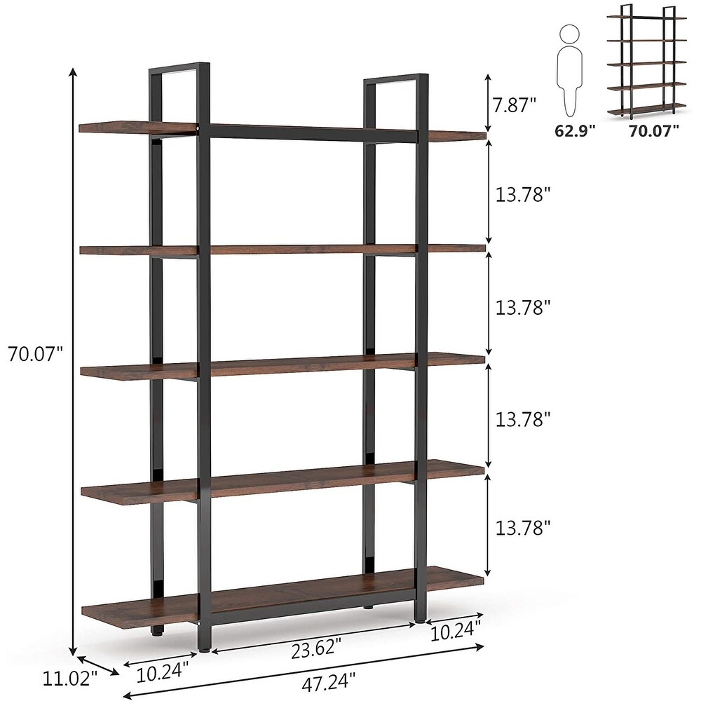 Introducing the Tribesigns 5-Tier Industrial Large Open Bookcase Bookshelf, the perfect storage solution for any space. Measuring 47.2" x 11'' x 71.7'', the 5-tier shelves provide ample storage space for all your items while maintaining a clean and contemporary design with rustic industrial style. Organize clutter or display your collection, decorations, and beautiful photos in your living room, study room, bedroom, office, and more. Made of thickened particleboard and solid metal frame, this bookshelf is built to last and has undergone rigorous testing to ensure safety standards are met. Hassle-free installation with a detailed manual and hardware included. Plus, our friendly technical support is always available to assist you.
